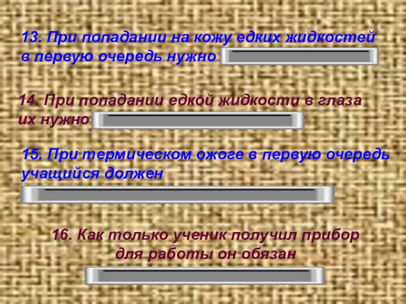 13. При попадании на кожу едких жидкостейв первую очередь нужно стряхнуть капли.14. При попадании едкой жидкости в