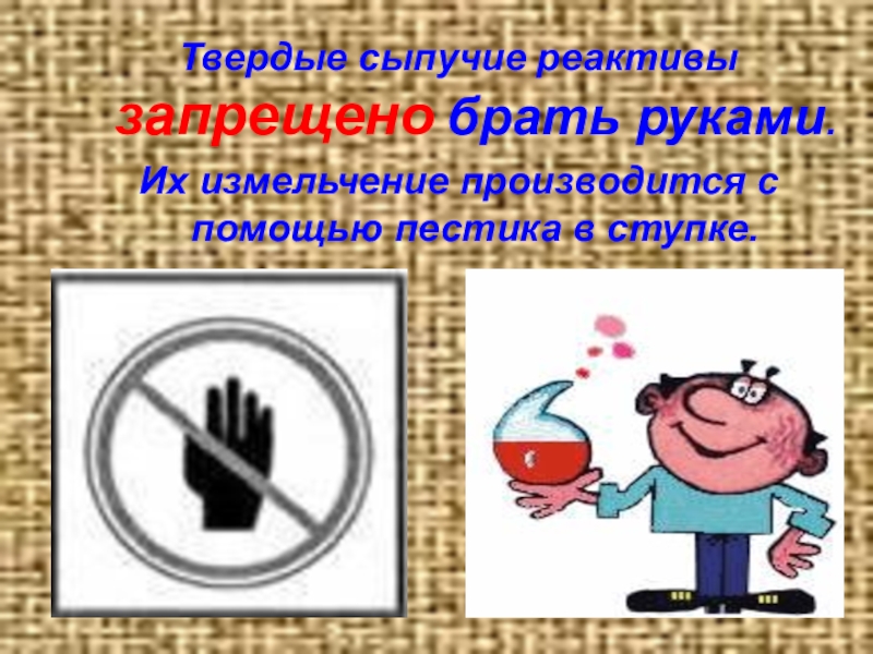Слайд 13Твердые сыпучие реактивы запрещено брать руками.