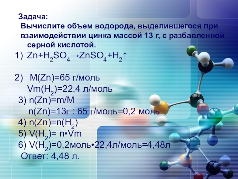 Задача: Вычислите объем водорода, выделившегося при взаимодействии цинка массой 13 г, с разбавленной серной кислотой. Zn+H2SO4→ZnSO4+H2↑ M(Zn)=65