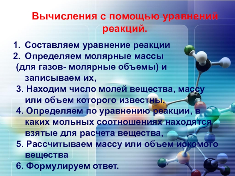 Вычисления с помощью уравнений реакций.Составляем уравнение реакцииОпределяем молярные массы(для газов- молярные объемы) и записываем их,3. Находим число