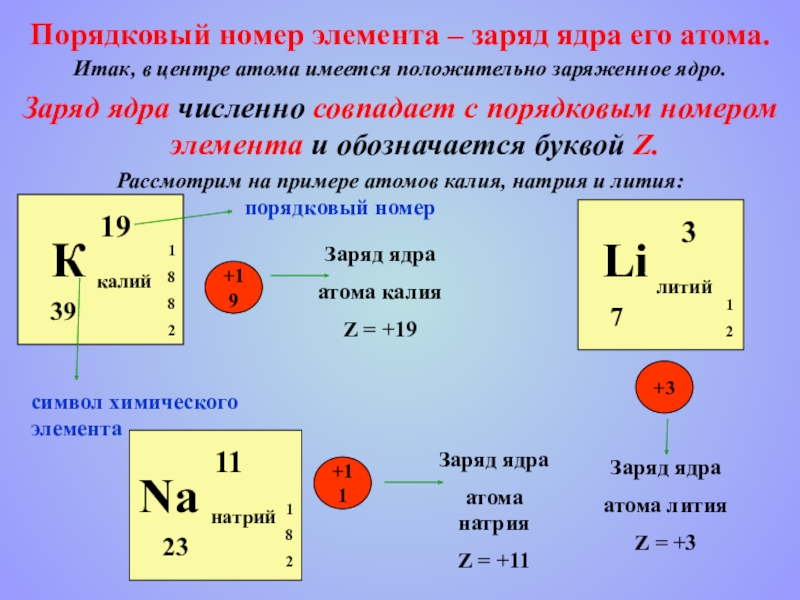 Порядковый номер элемента – заряд ядра его атома.