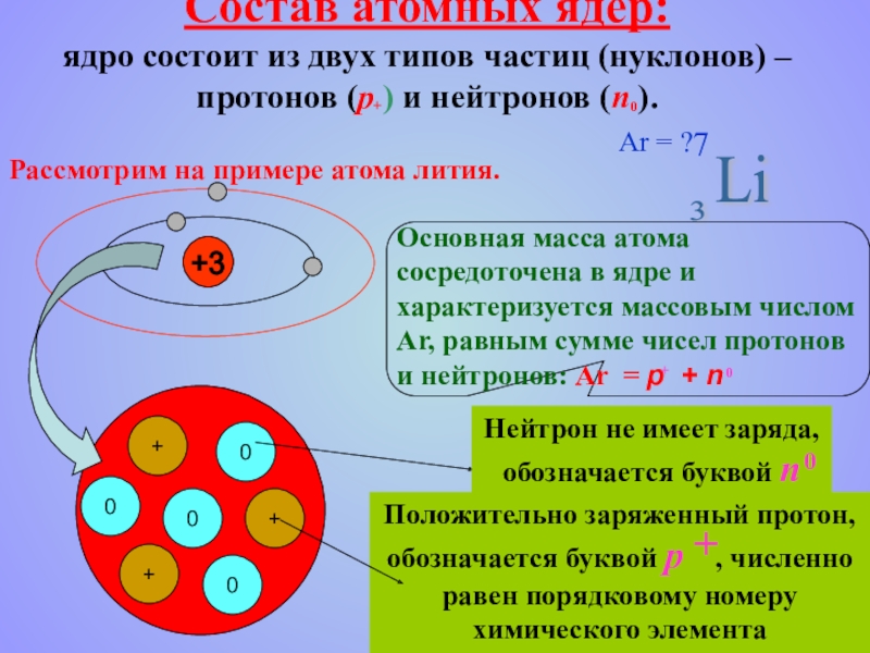 Ядро атома лития: 3 протона и 4 нейтрона