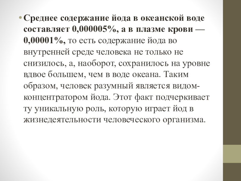 Слайд 13Среднее содержание йода в океанской воде составляет 0,000005%, а в плазме
