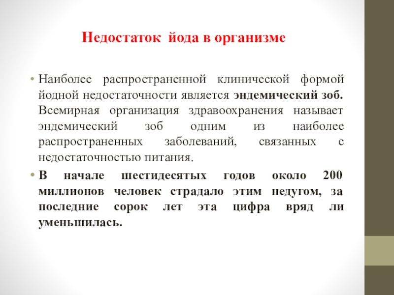 зоб. Всемирная организация здравоохранения называет эндемический зоб одним из наиболее распространенных заболеваний, связанных с недостаточностью питания.