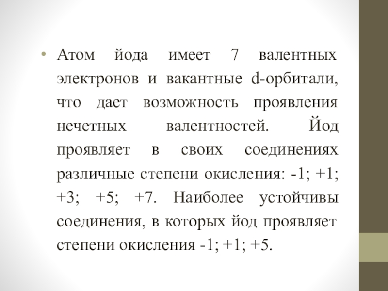 возможность проявления нечетных валентностей. Йод проявляет в своих соединениях различные степени окисления: -1; +1; +3; +5; +7. Наиболее устойчивы соединения, в которых йод проявляет степени окисления -1; +1; +5.