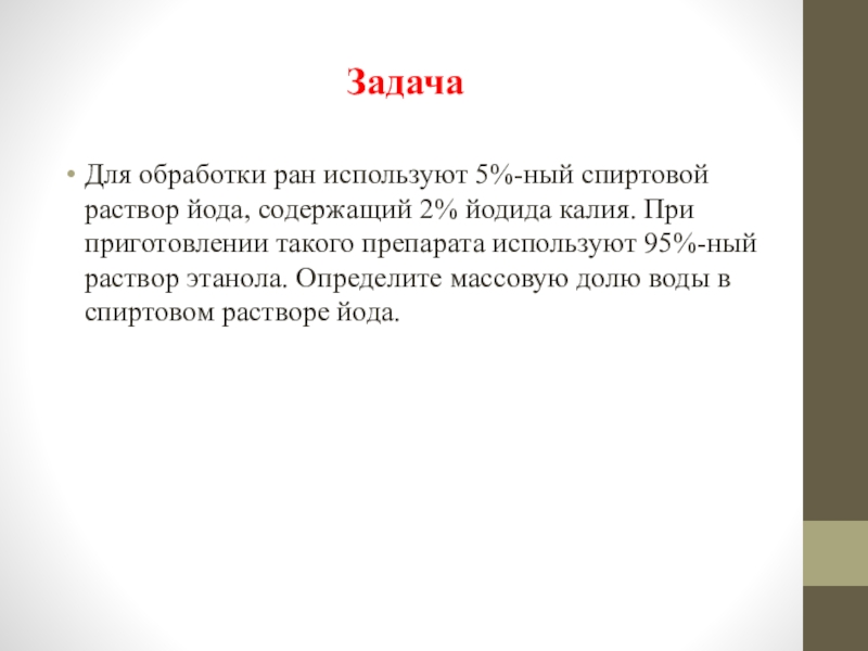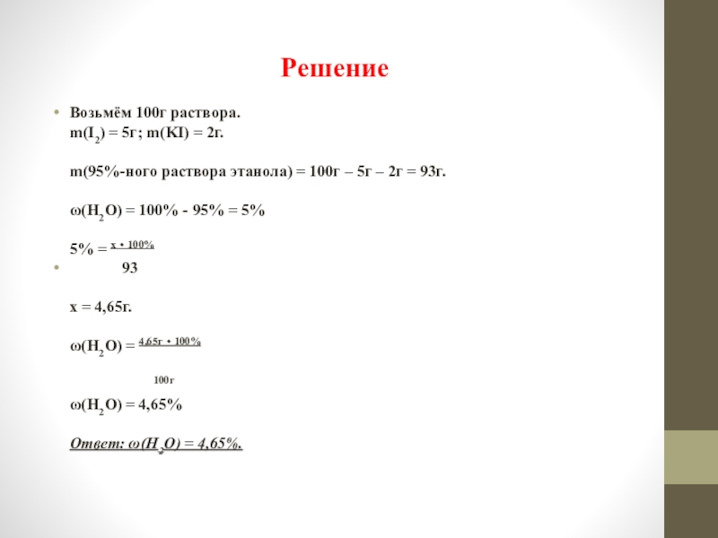 калия. При приготовлении такого препарата используют 95%-ный раствор этанола. Определите массовую долю воды в спиртовом растворе йода.