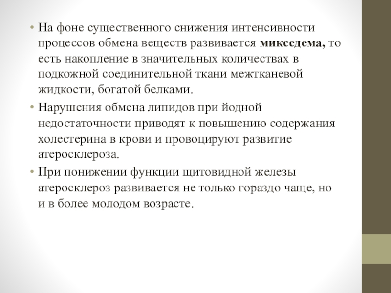 Слайд 20На фоне существенного снижения интенсивности процессов обмена веществ развивается микседема, то