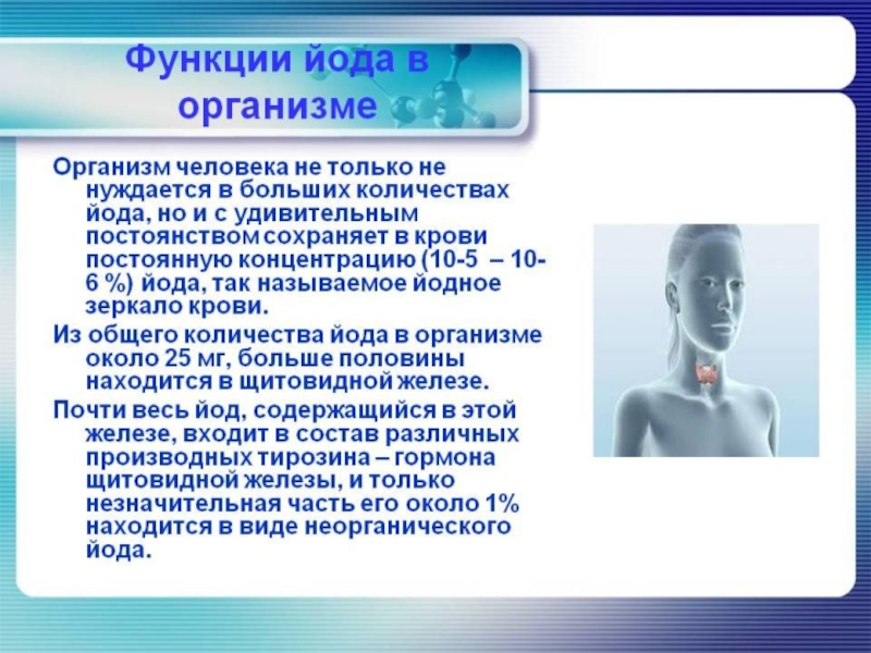 крови — 0,00001%, то есть содержание йода во внутренней среде человека не только не снизилось, а, наоборот, сохранилось на уровне вдвое большем, чем в воде океана. Таким образом, человек разумный является видом-концентратором йода. Этот факт подчеркивает ту уникальную роль, которую играет йод в жизнедеятельности человеческого организма.
