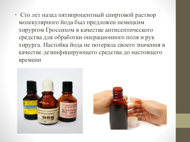 немецким хирургом Гроссихом в качестве антисептического средства для обработки операционного поля и рук хирурга. Настойка йода не потеряла своего значения в качестве дезинфицирующего средства до настоящего времени