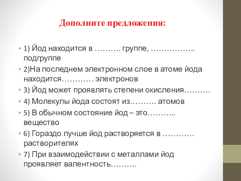 7) При взаимодействии с металлами йод проявляет валентность……….
