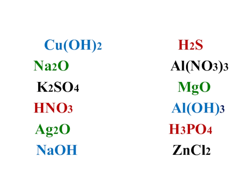 Cu(OH)2, Na2O, K2SO4, HNO3 , Ag2O, NaOH, H2S, Al(NO3)3, MgO, Al(OH)3, H3PO4 , ZnCl2