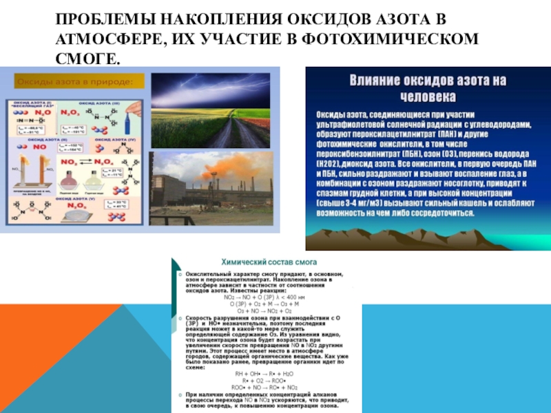 Слайд 17Проблемы накопления оксидов азота в атмосфере, их участие в фотохимическом смоге.