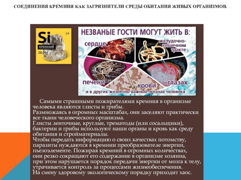 Слайд 25Соединения кремния как загрязнители среды обитания живых организмов.