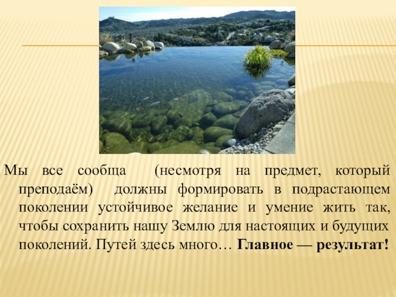 подрастающем поколении устойчивое желание и умение жить так, чтобы сохранить нашу Землю для настоящих и будущих поколений. Путей здесь много… Главное — результат!