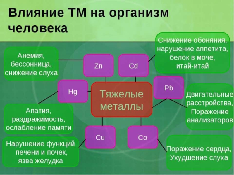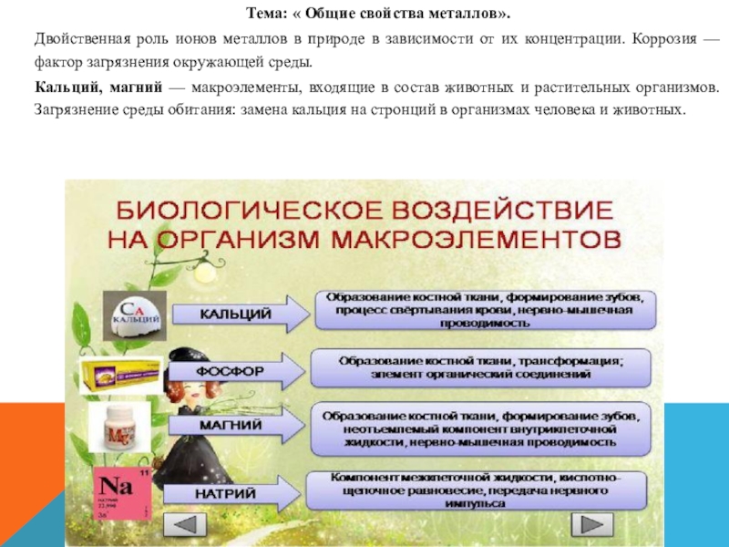 Кальций, магний — макроэлементы, входящие в состав животных и растительных организмов. Загрязнение среды обитания: замена кальция на стронций в организмах человека и животных.