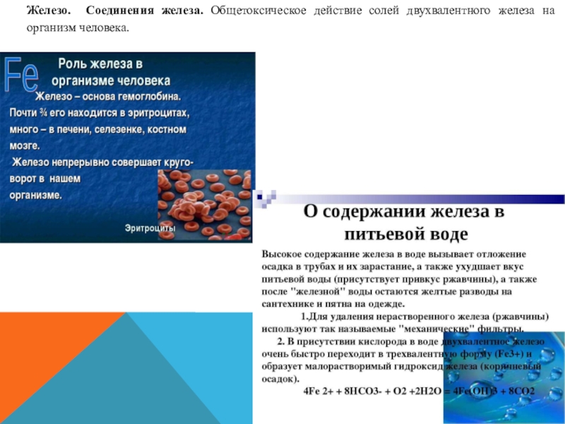 Слайд 29Железо. Соединения железа. Общетоксическое действие солей двухвалентного железа на организм человека.