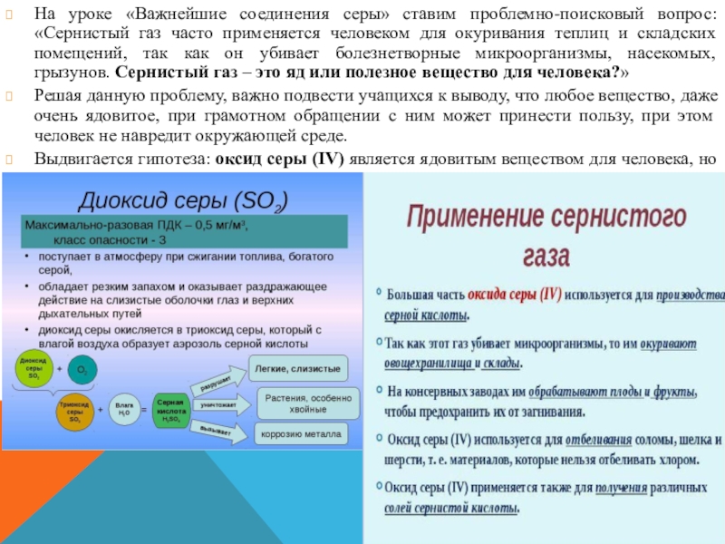 Слайд 34На уроке «Важнейшие соединения серы» ставим проблемно-поисковый вопрос: «Сернистый газ часто