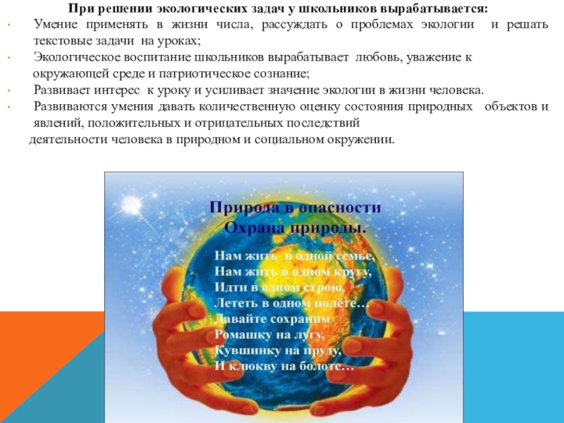 рассуждать о проблемах экологии и решать текстовые задачи на уроках;