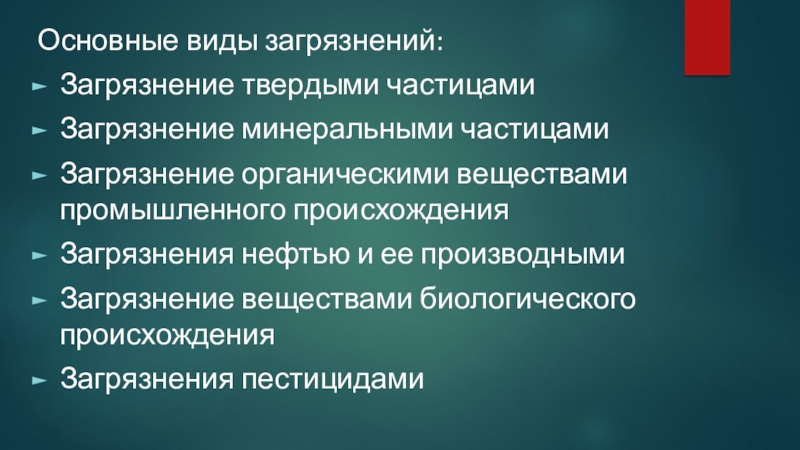 Основные виды загрязнений:Загрязнение твердыми частицамиЗагрязнение минеральными частицамиЗагрязнение органическими веществами промышленного происхожденияЗагрязнения нефтью и ее производнымиЗагрязнение веществами биологического