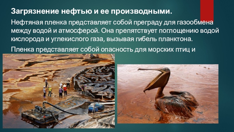 Загрязнение нефтью и ее производными.Нефтяная пленка представляет собой преграду для газообмена между водой и атмосферой. Она препятствует