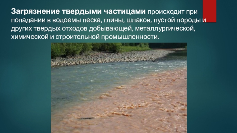 Слайд 4Загрязнение твердыми частицами происходит при попадании в водоемы песка, глины, шлаков,