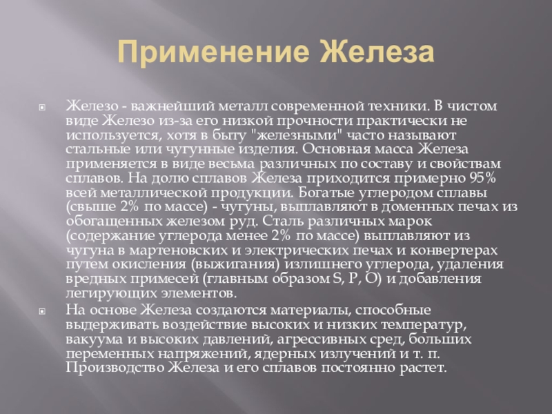 из-за его низкой прочности практически не используется, хотя в быту "железными" часто называют стальные или чугунные изделия. Основная масса Железа применяется в виде весьма различных по составу и свойствам сплавов. На долю сплавов Железа приходится примерно 95% всей металлической продукции. Богатые углеродом сплавы (свыше 2% по массе) - чугуны, выплавляют в доменных печах из обогащенных железом руд. Сталь различных марок (содержание углерода менее 2% по массе) выплавляют из чугуна в мартеновских и электрических печах и конвертерах путем окисления (выжигания) излишнего углерода, удаления вредных примесей (главным образом S, P, О) и добавления легирующих элементов.
