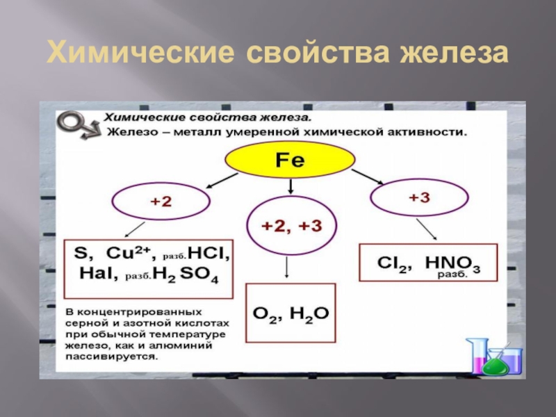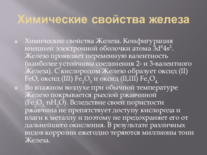 Химические свойства Железа. Конфигурация внешней электронной оболочки атома 3d64s2.