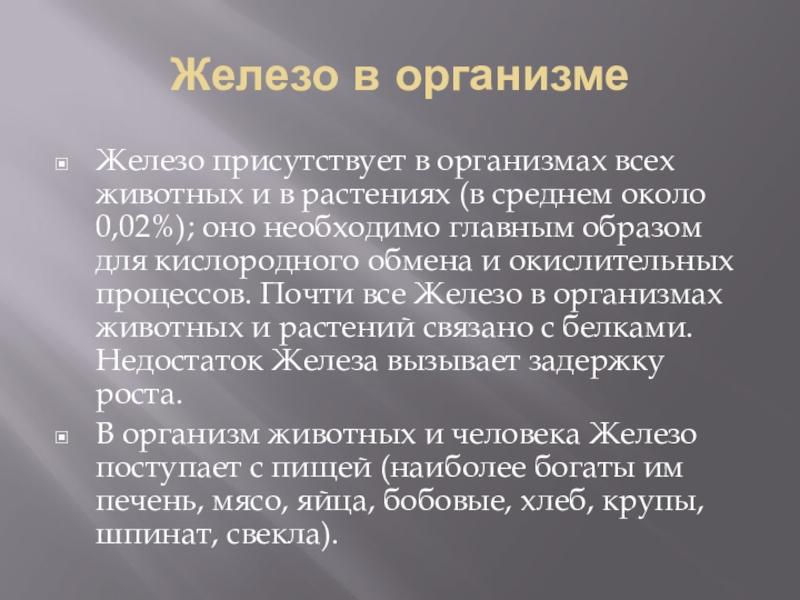 (в среднем около 0,02%); оно необходимо главным образом для кислородного обмена и окислительных процессов. Почти все Железо в организмах животных и растений связано с белками. Недостаток Железа вызывает задержку роста.