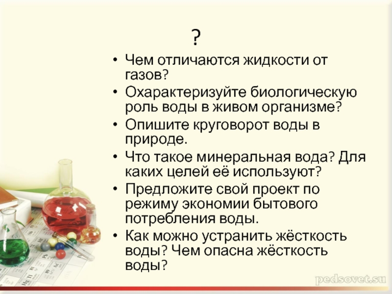? Чем отличаются жидкости от газов?Охарактеризуйте биологическую роль воды в живом организме? Опишите круговорот воды в природе.Что