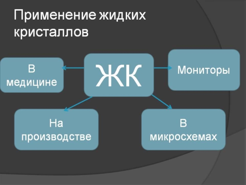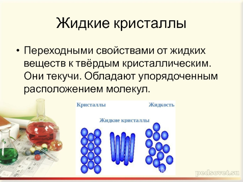 Жидкие кристаллы Переходными свойствами от жидких веществ к твёрдым кристаллическим. Они текучи. Обладают упорядоченным расположением молекул.
