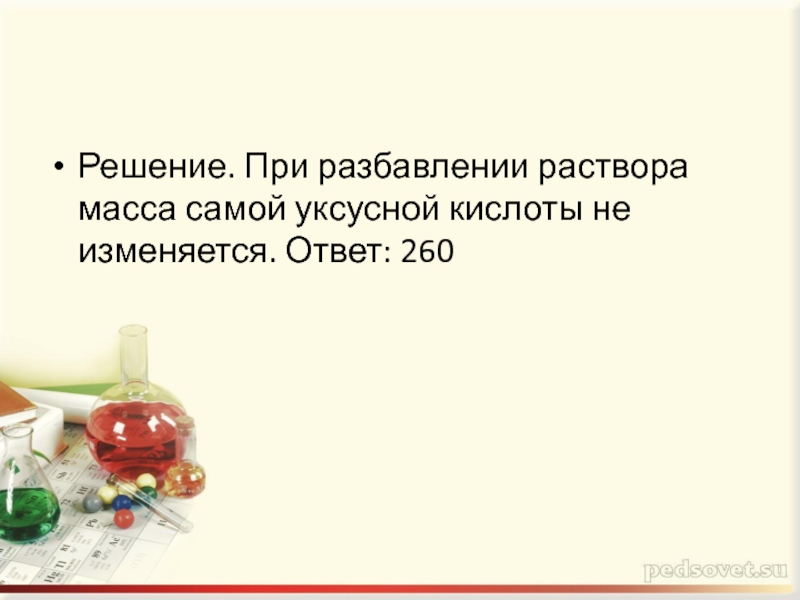 Решение. При разбавлении раствора масса самой уксусной кислоты не изменяется. Ответ: 260