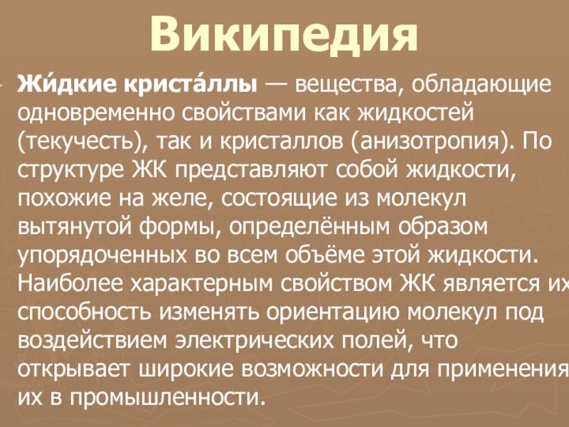Википедия Жи́дкие криста́ллы — вещества, обладающие одновременно свойствами как жидкостей (текучесть), так и кристаллов (анизотропия). По структуре ЖК
