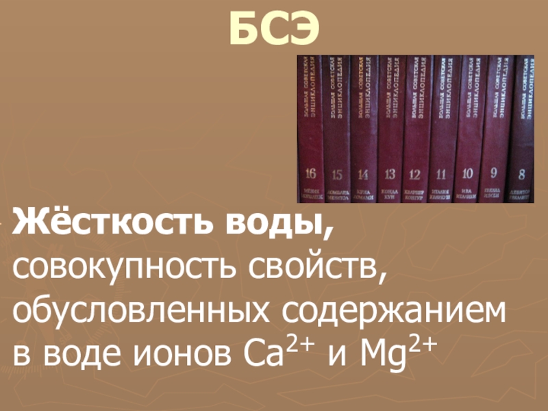 БСЭЖёсткость воды, совокупность свойств, обусловленных содержанием в воде ионов Са2+ и Mg2+