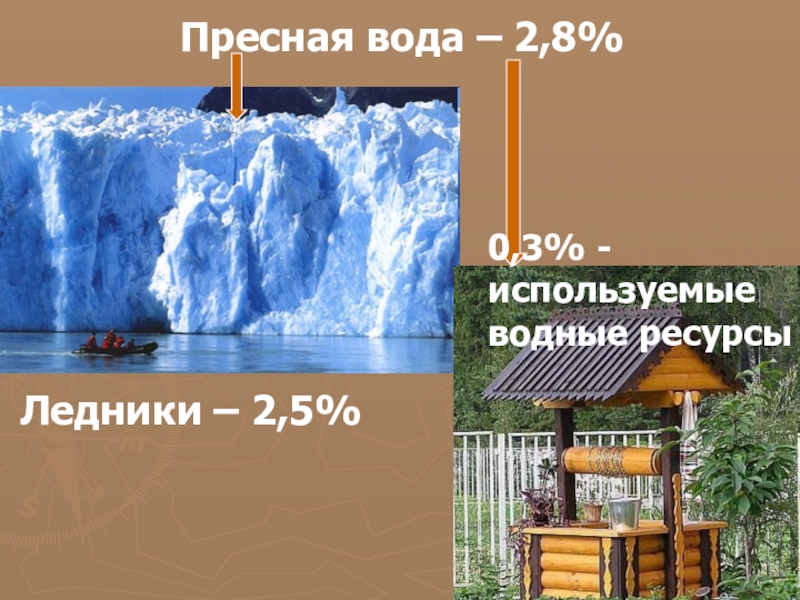 Пресная вода – 2,8%Ледники – 2,5%0,3% - используемые водные ресурсы