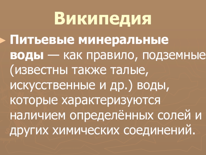 Питьевые минеральные воды — как правило, подземные (известны также талые, искусственные и