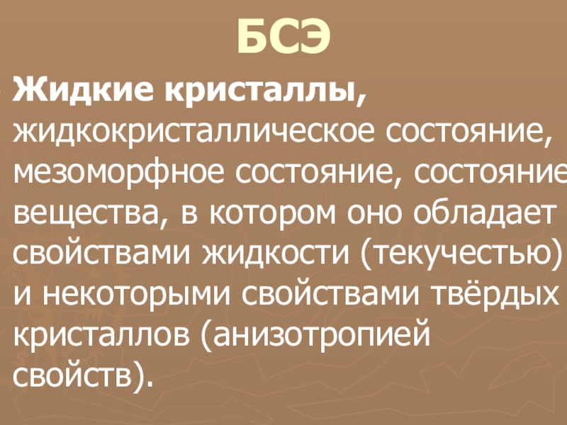 БСЭЖидкие кристаллы, жидкокристаллическое состояние, мезоморфное состояние, состояние вещества, в котором оно обладает свойствами жидкости (текучестью) и некоторыми