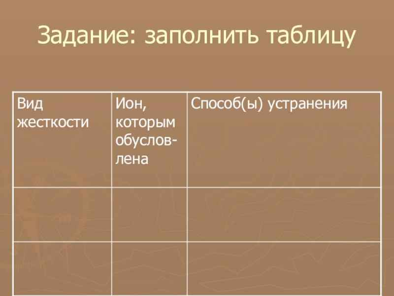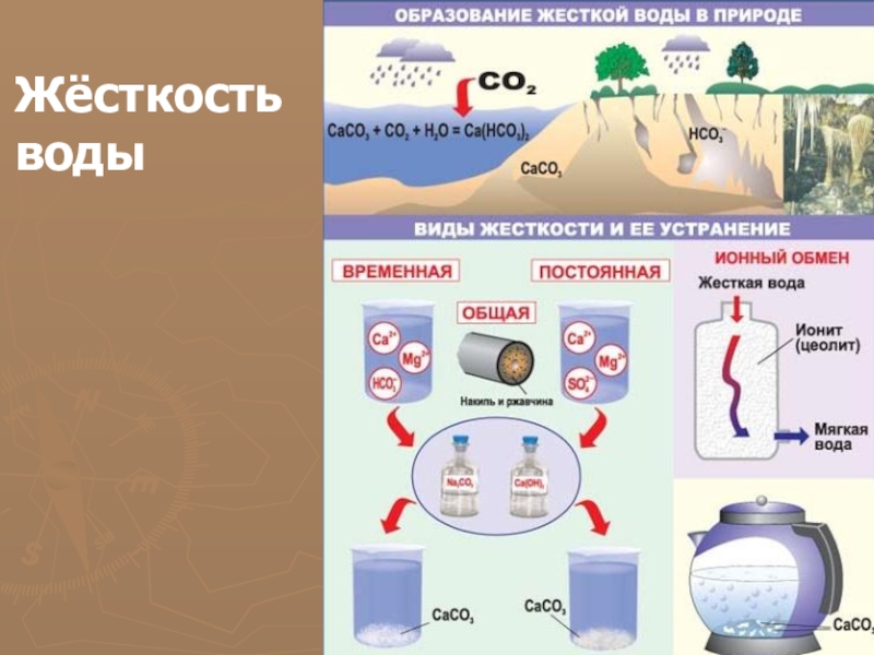 содержанием в ней растворённых солей щёлочноземельных металлов, главным образом, кальция и магния. Вода с большим содержанием таких солей называется жёсткой, с малым содержанием — мягкой
