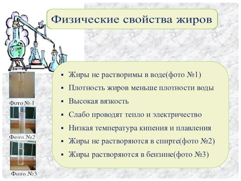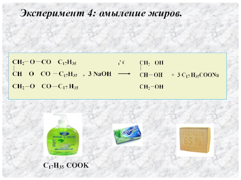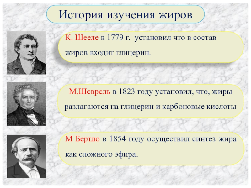 М.Шеврель в 1823 году установил, что, жиры разлагаются на глицерин и карбоновые кислоты