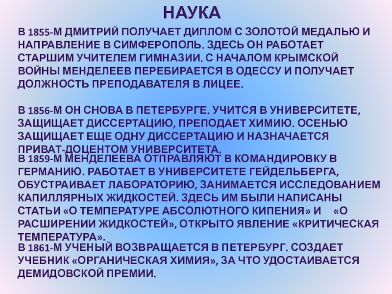 В 1859-м Менделеева отправляют в командировку в Германию. Работает в университете Гейдельберга, обустраивает лабораторию, занимается исследованием капиллярных жидкостей. Здесь им были написаны статьи «О температуре абсолютного кипения» и «О расширении жидкостей», открыто явление «критическая температура».