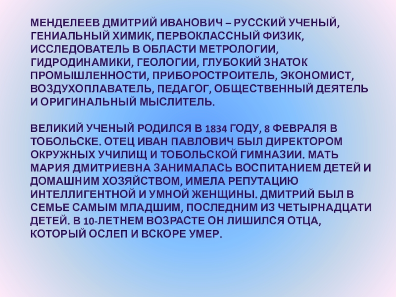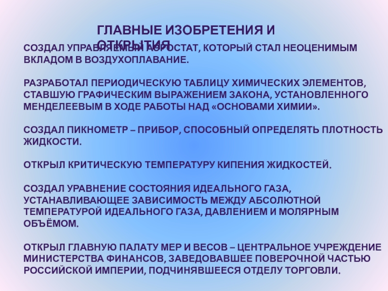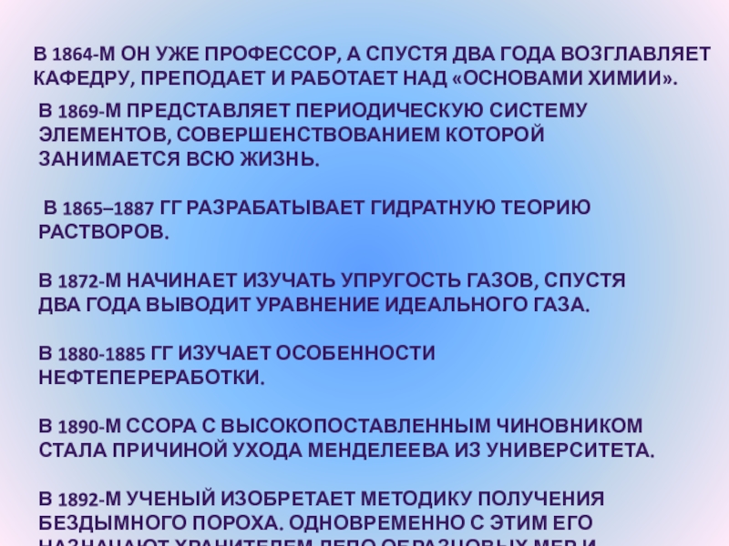 В 1864-м он уже профессор, а спустя два года возглавляет кафедру, преподает и работает над «Основами химии».