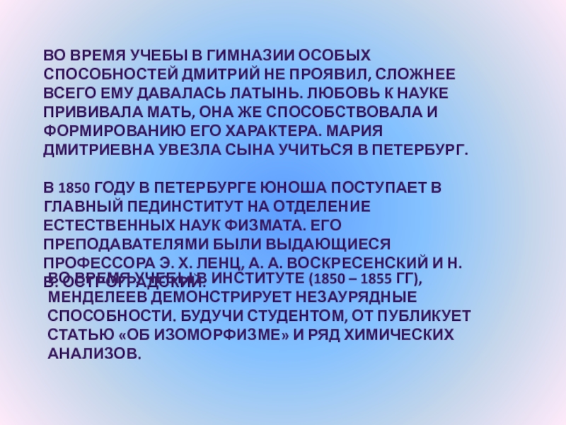 Во время учебы в институте (1850 – 1855 гг), Менделеев демонстрирует незаурядные способности. Будучи студентом, от публикует статью «Об изоморфизме» и ряд химических анализов.