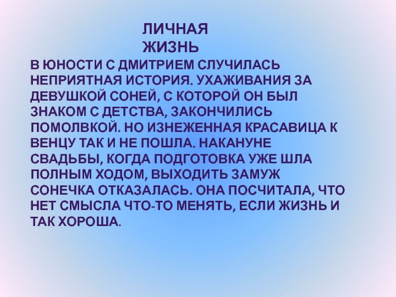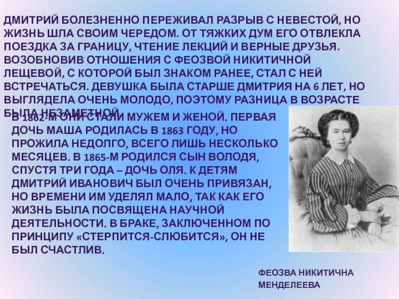 В 1862-м они стали мужем и женой. Первая дочь Маша родилась в 1863 году, но прожила недолго, всего лишь несколько месяцев. В 1865-м родился сын Володя, спустя три года – дочь Оля. К детям Дмитрий Иванович был очень привязан, но времени им уделял мало, так как его жизнь была посвящена научной деятельности. В браке, заключенном по принципу «стерпится-слюбится», он не был счастлив.