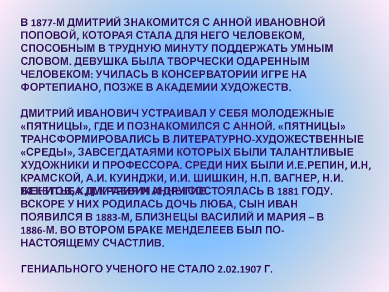 Женитьба Дмитрия и Анны состоялась в 1881 году. Вскоре у них родилась дочь Люба, сын Иван появился в 1883-м, близнецы Василий и Мария – в 1886-м. Во втором браке Менделеев был по-настоящему счастлив.
