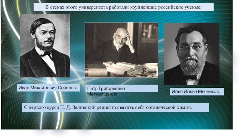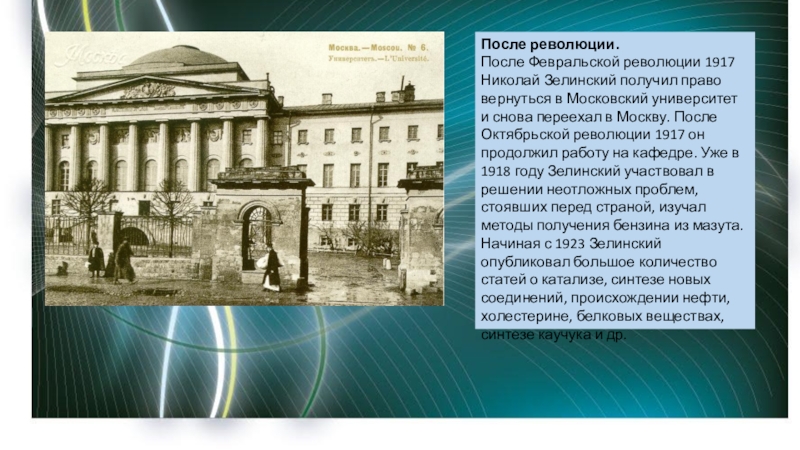 органических соединений. Продолжая исследования российского химика Владимира Васильевича Марковникова, он усиленно разрабатывал проблему рационального использования нефти, в частности вопросы ее ароматизации. В 1911 Зелинский открыл дегидрогенизационный катализ нафтенов с применением платины и палладия. Результатом этих исследований явился пуск первого в России производства термического крекинга нефти.