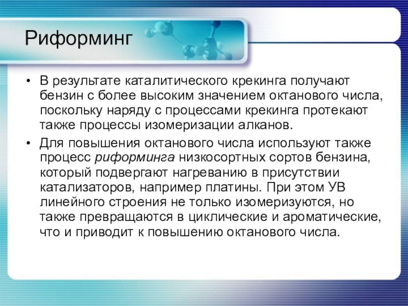 Для повышения октанового числа используют также процесс риформинга низкосортных сортов бензина, который подвергают нагреванию в присутствии катализаторов, например платины. При этом УВ линейного строения не только изомеризуются, но также превращаются в циклические и ароматические, что и приводит к повышению октанового числа.