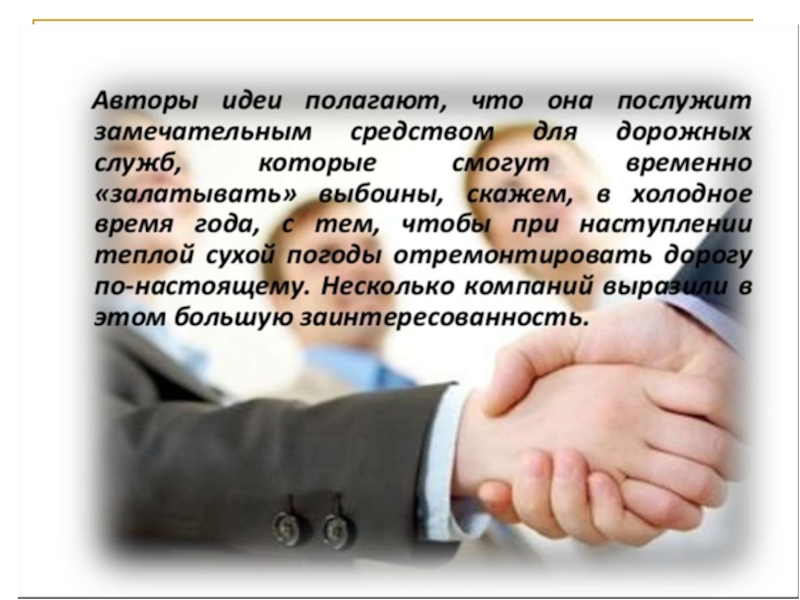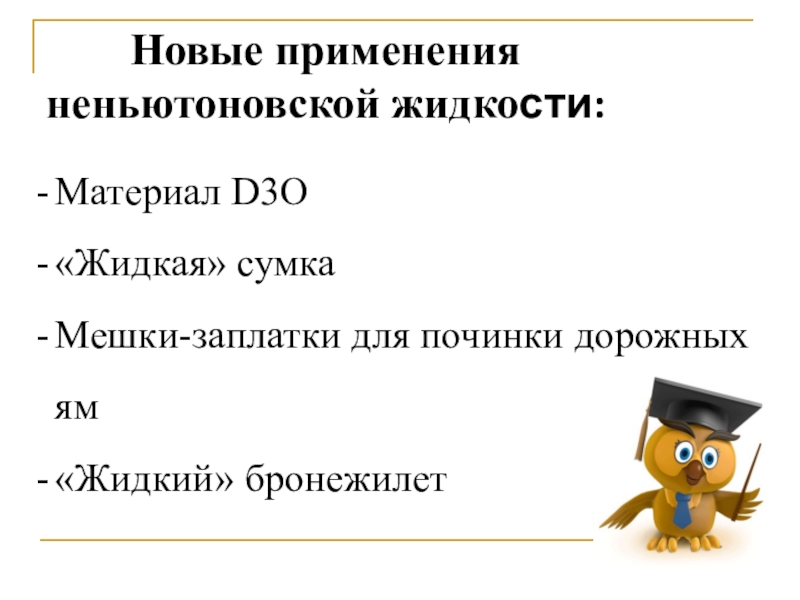 латать дорожное покрытие водонепроницаемыми мешками, наполненными неньютоновской жидкостью. Неньютоновская жидкость – замечательный материал для дорожных выбоин: в отсутствие внешнего давления она растекается, заполняя яму и образуя гладкую поверхность. Но как только на неё наезжает колесо автомобиля, она превращается в твердую, как асфальт, субстанцию. По словам разработчиков, неньютоновская жидкость пришла им в голову из-за своей дешевизны (обычная грязь с водой и крахмалом — и та ведёт себя как неньютоновская жидкость) и особых физических свойств.