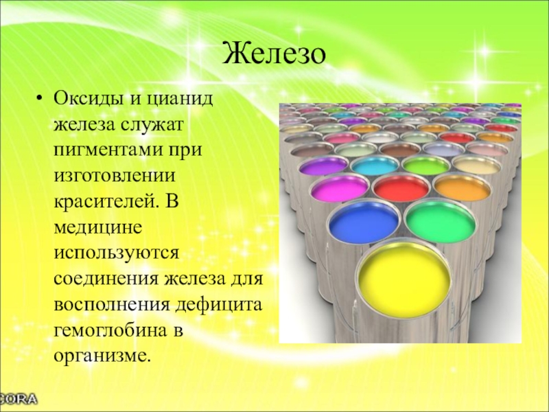 Оксиды и цианид железа служат пигментами при изготовлении красителей. В медицине