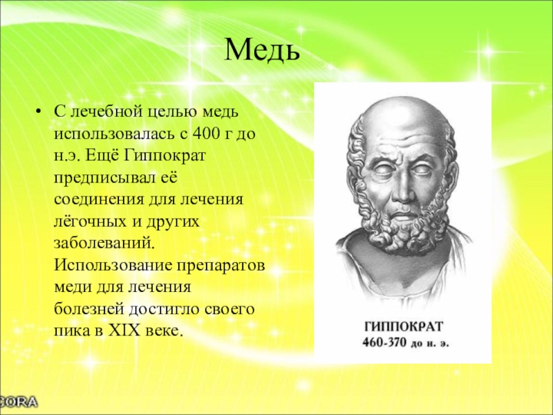 С лечебной целью медь использовалась с 400 г до н.э. Ещё