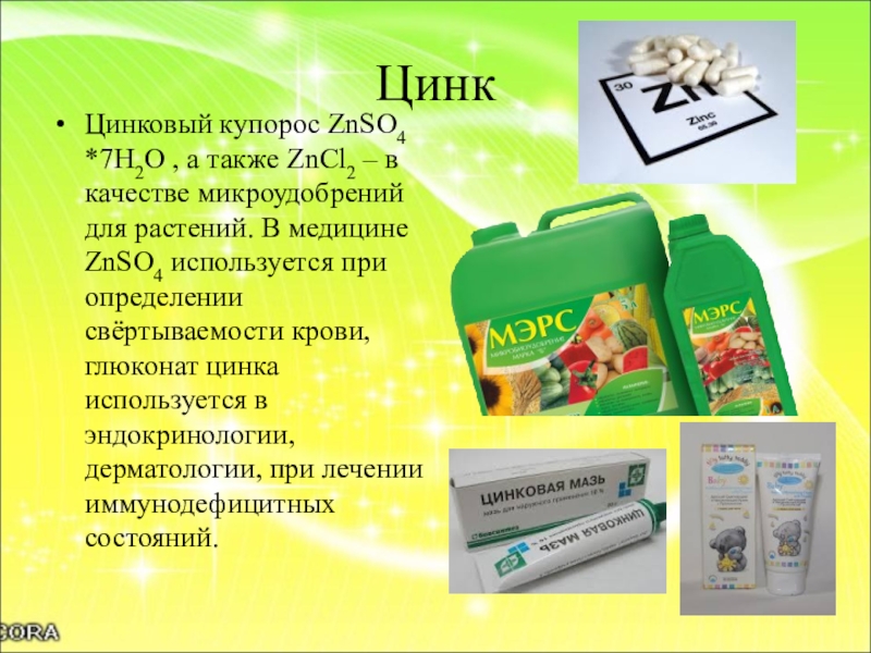 микроудобрений для растений. В медицине ZnSO4 используется при определении свёртываемости крови, глюконат цинка используется в эндокринологии, дерматологии, при лечении иммунодефицитных состояний.