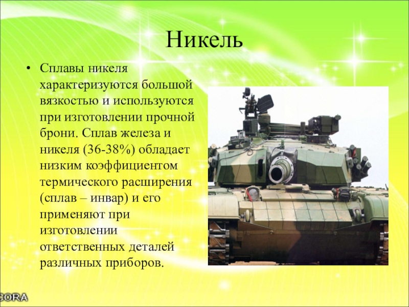 Сплавы никеля характеризуются большой вязкостью и используются при изготовлении прочной брони.